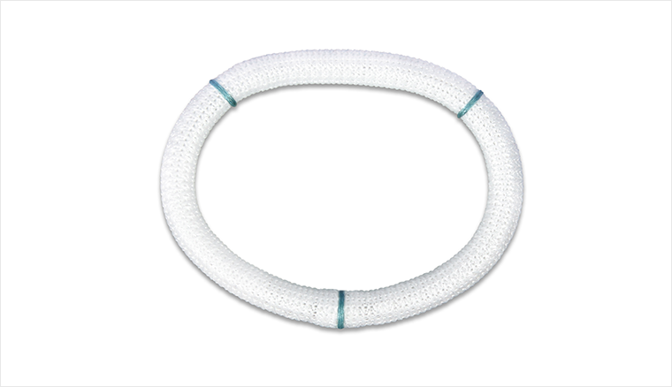环体支撑管外部包被有一层质地柔软而富有弹性的医用聚酯编织物。这层编织物不仅保证了环体与瓣环组织有很好的贴附,同时具有很好的生物相容性。经动物实验证实,该人工瓣环被植入3周后即可被心内膜全部覆盖。
